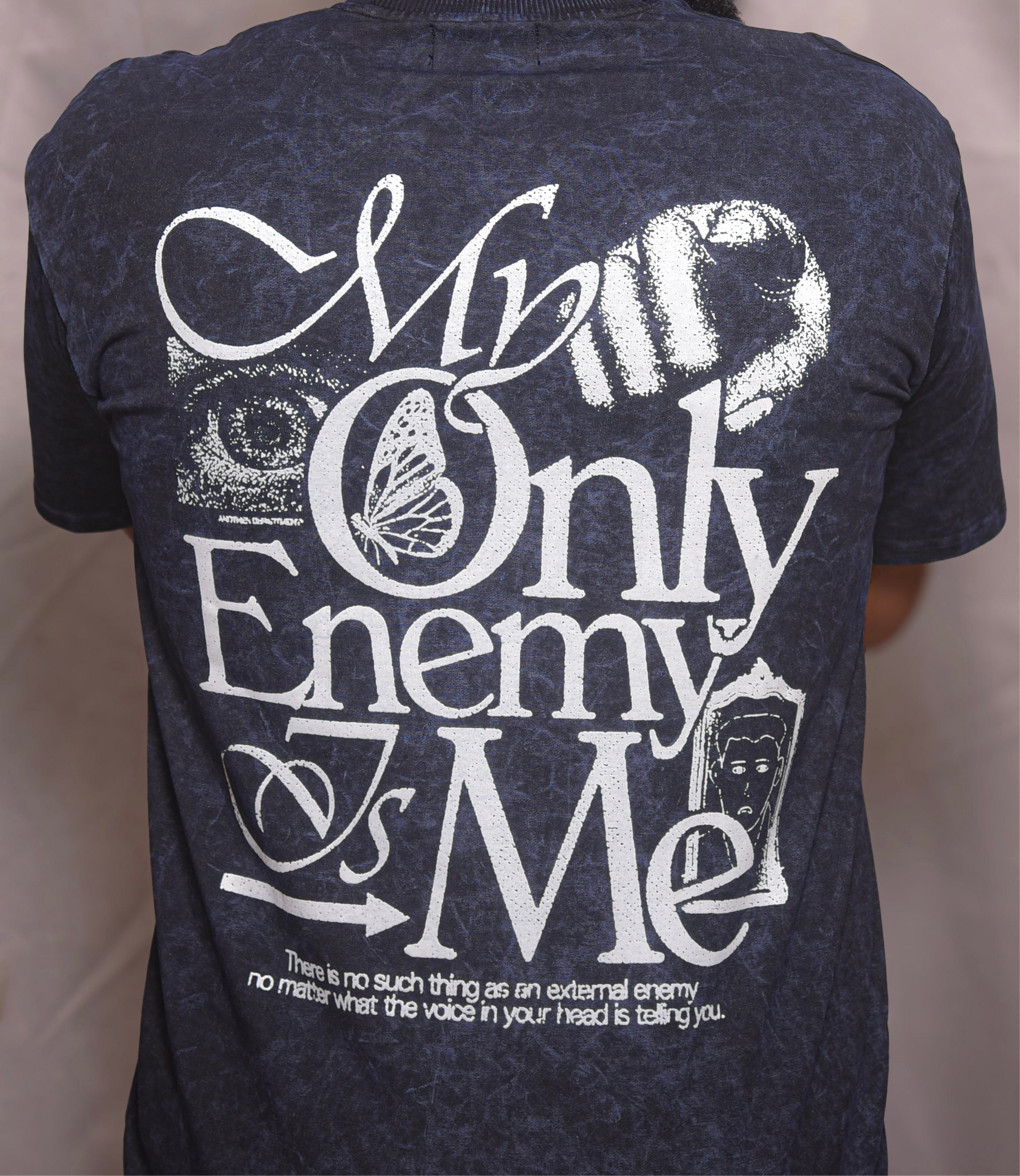 alongside powerful visuals like a butterfly, eye, and mirror. This design serves as a reminder that our greatest battles are often internal. At the bottom, the quote “There is no such thing as an external enemy, no matter what the voice in your head is telling you” reinforces the message of self-reflection and mental clarity.